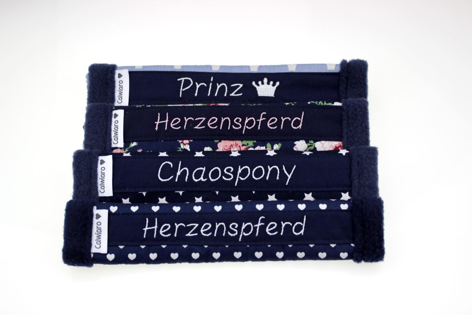 Wir haben unsere Nosebands so konzipiert, dass sie ganz einfach durch einen Klettverschluss an alle gängigen Halftern angebracht werden können. So hast du die Möglichkeit, dein Lieblingshalfter aufzuhübschen und mit dem Namen von deinem Pferd/Pony zu versehen.