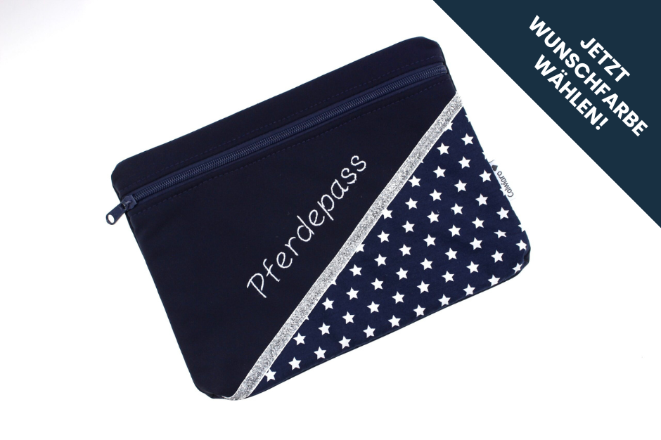 Wichtige Info für dich: Das Wort “Pferdepass” oder “Equidenpass” ist nur ein Musterbeispiel. Es wird das eingestickt, was von dir in dem Feld “Personalisierung” eingetragen wird. Möchtest du auf deiner Hülle z.B. “Pferdepass”, anstelle eines Namen eingestickt haben, müsste dies auch in dem Feld “Personalisierung” angegeben werden. Bei einer Bestickung aus mehreren Wörtern, werden diese gegebenenfalls angepasst untereinander gestickt.
