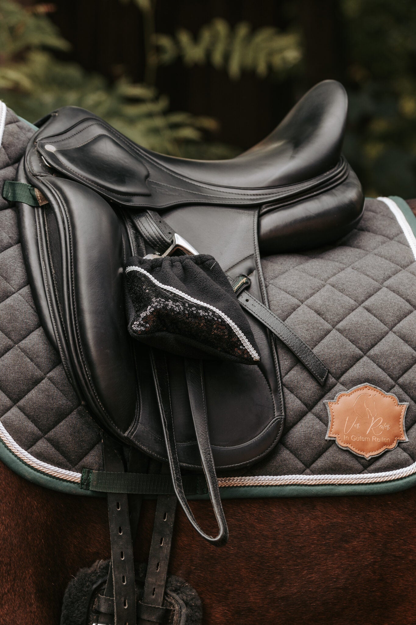 So bestellst du deine individuellen Steigbügelschoner mit Glitzer: