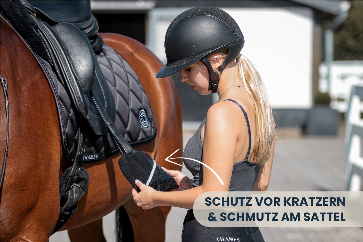 Deine Steigbügel sind täglich im Einsatz und genau das hinterlässt Spuren. Unsere Steigbügelschoner schützen Sattel und Steigbügel zuverlässig vor Schmutz, Kratzern und Abnutzung. Handgefertigt aus weichem, langlebigem Fleece, lassen sie sich leicht anbringen und sitzen dank formstabilem Gummizug perfekt und dein Equipment bleibt sauber und gepflegt – ganz egal, ob du klassische, breite oder Sicherheitssteigbügel nutzt. So bleibt dein Sattel länger schön und du hast länger Freude an deinem Equipment.