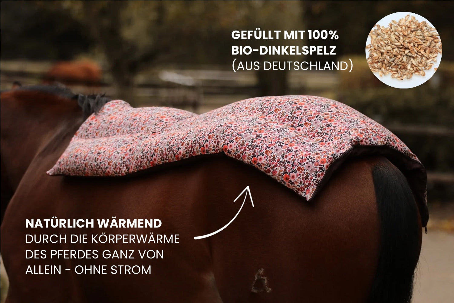 Unser Wärmekissen wurde entwickelt, um dein Pferd auf Bewegung und Training vorzubereiten. Es hilft dabei, Verspannungen zu lösen – auf natürliche Weise und ohne zusätzliche Wärmequelle. Die Füllung aus 100% Bio-Dinkelspelz erwärmt sich durch die Körperwärme deines Pferdes und sorgt für eine gleichmäßige, sanfte Wärmeverteilung, die die Durchblutung fördert & Verspannungen lösen kann. Das dreigeteilte Kammer-System verhindert Hitzestau und passt sich optimal an den Pferdekörper an – somit ideal bei Verspannungen, Steifheit oder einfach als wohltuendes Ritual vor dem Reiten.
